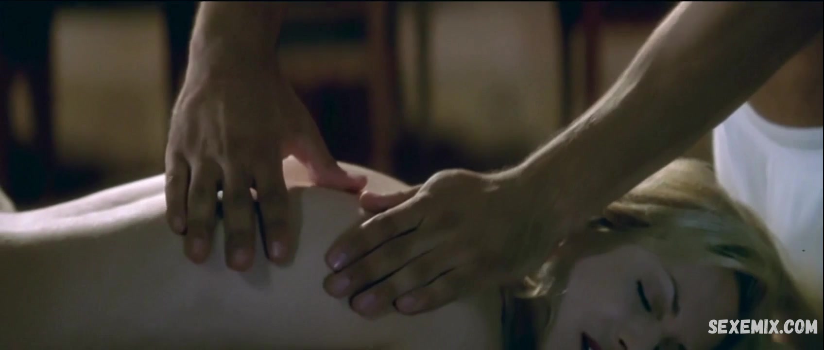 Holly Hunter se quita el albornoz y miramos sus tetas, su cuerpo sexy y su culo desnudo. Ella se acuesta en la camilla de masajes.
