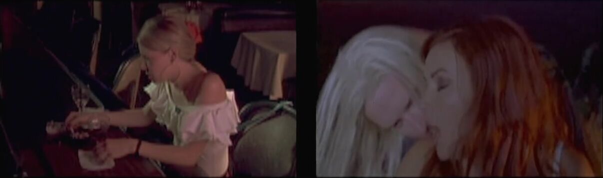 Jennifer Tilly Szene aus Fast Sofa (2001). Jennifer Tilly ist in dem Clip zu sehen, wie sie auf dem Spiegel sitzt, während ihr männlicher Partner ihre Kleidung öffnet und ...