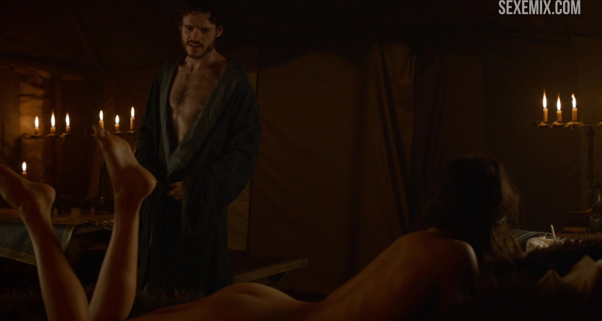 Oona Chaplin desnuda acostada en la cama, escena de Juego de Tronos
